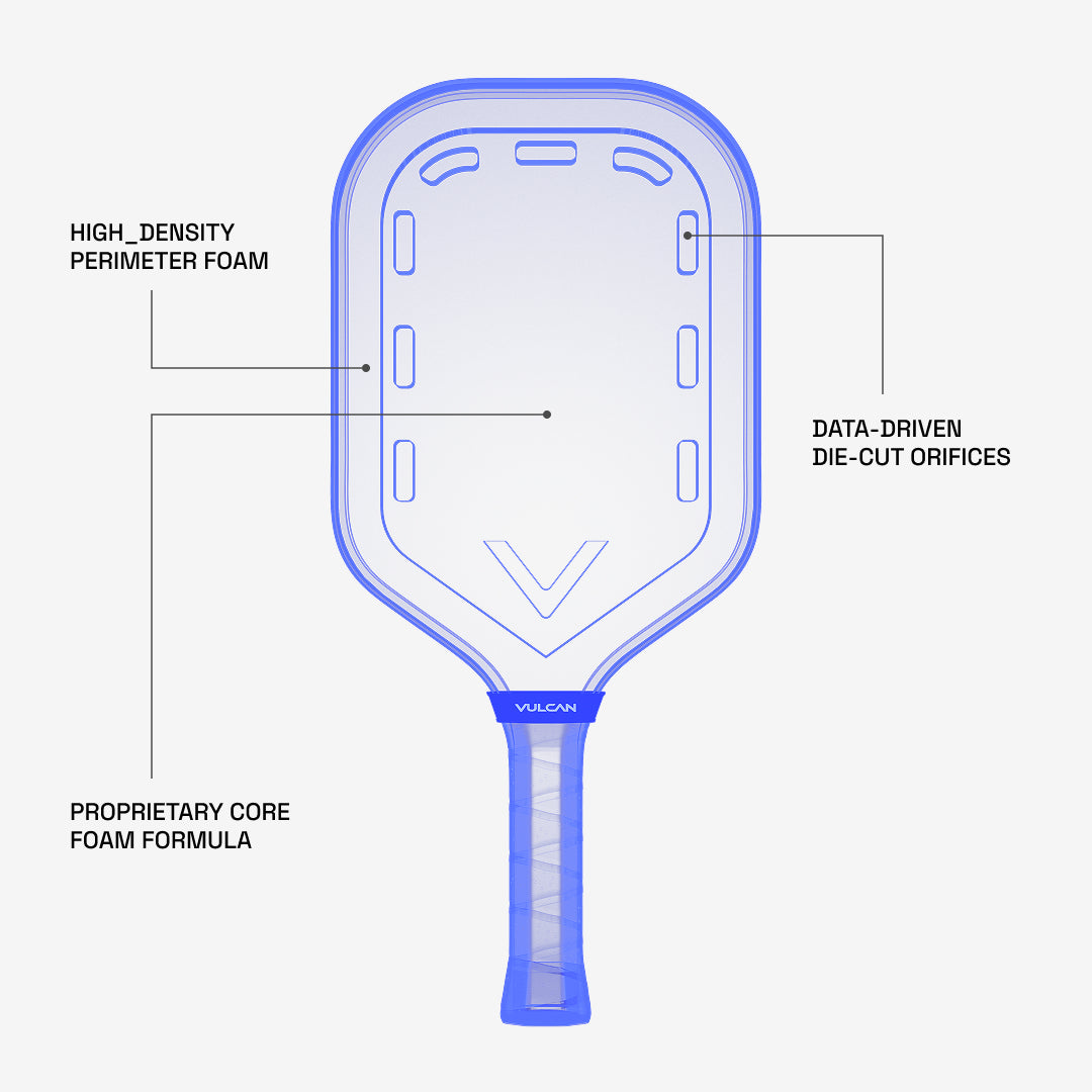 Two foams. Two jobs. The V-Foam core pairs a high energy outer core for explosive drives with a responsive inner core for soft touch and control at the net. Ten internal orifices expand the sweet spot so off center hits still feel clean. No break-in period, no core crush, no dead spots.